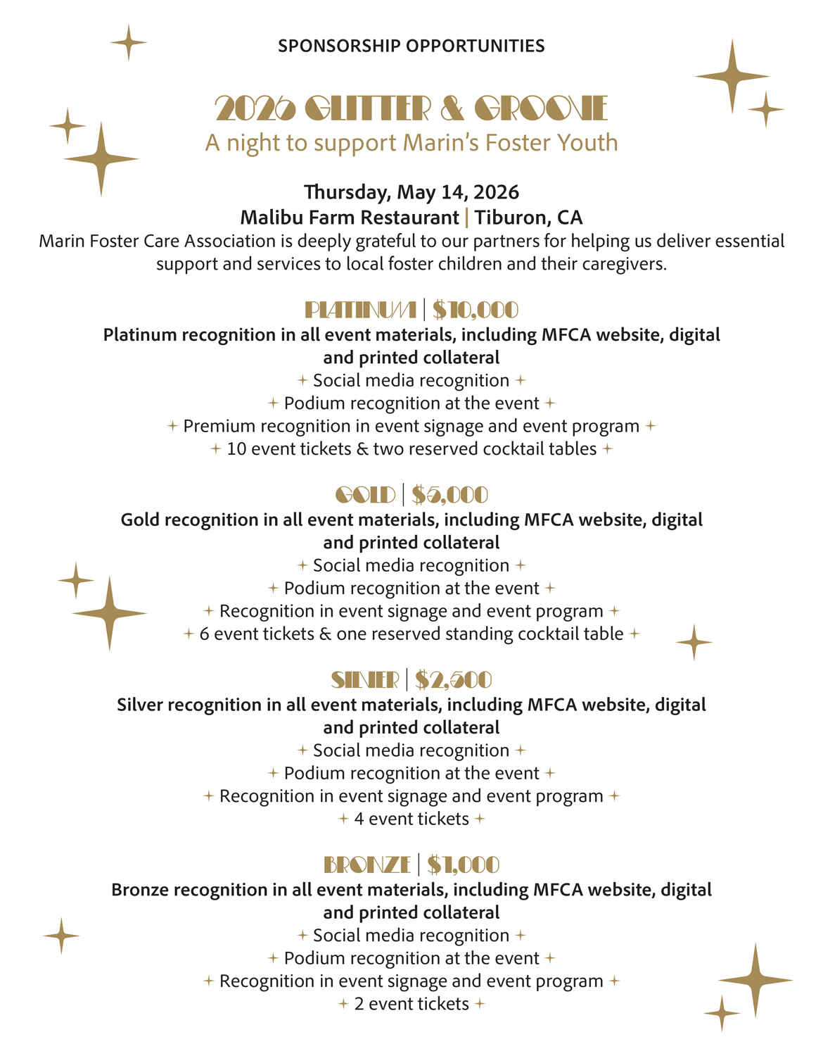 I authorize Marin Foster Care Association to use the credit card entered on the submission page at event Glitter & Groove 2026. Once the transaction has completed successfully, a confirmation receipt will be sent to the email address entered.